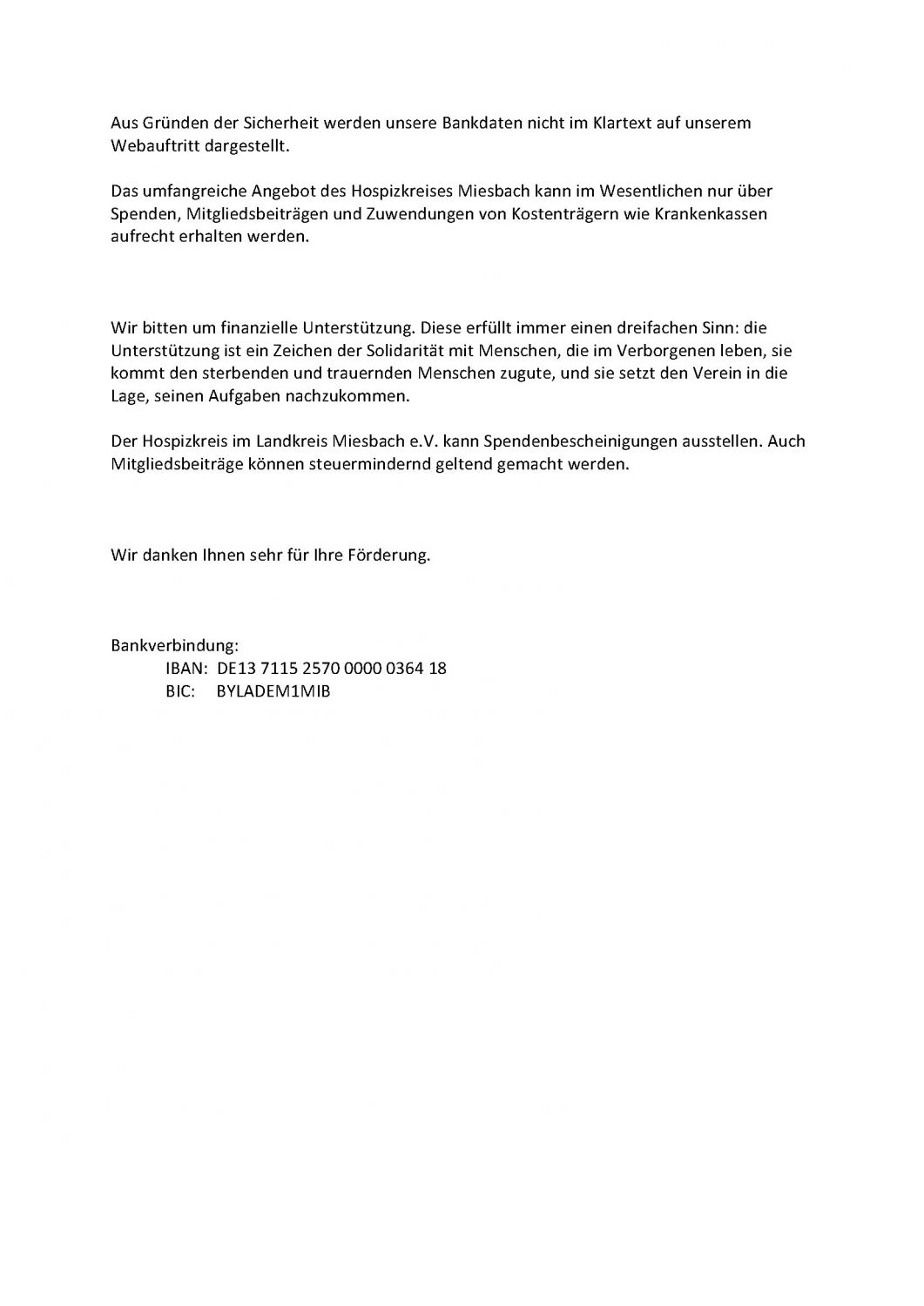 Das umfangreiche Angebot des Hospizkreises Miesbach kann im Wesentlichen nur über Spenden, Mitgliedsbeiträgen und Zuwendungen von Kostenträgern wie Krankenkassen aufrecht erhalten werden.